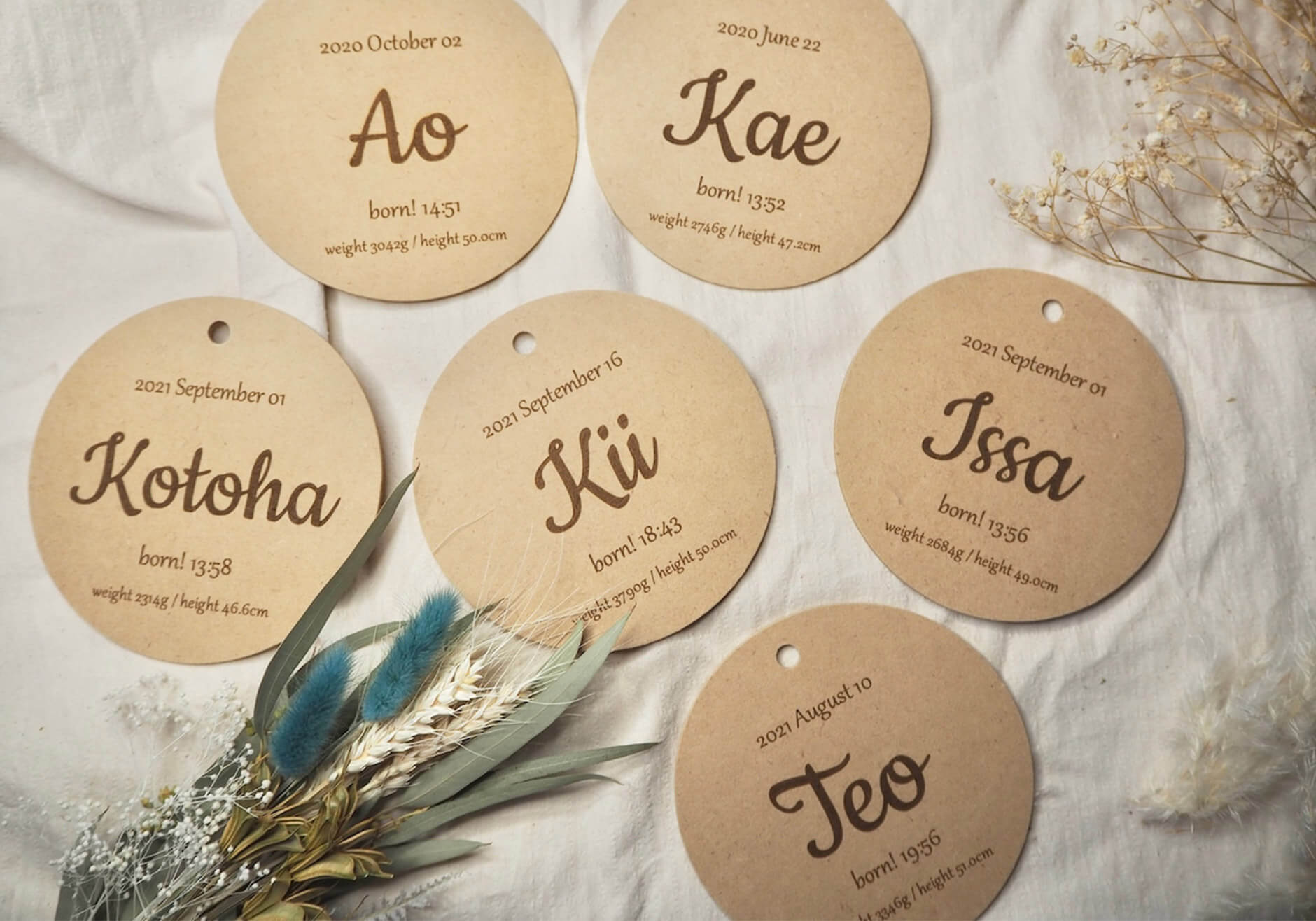 お子様の誕生日やお名前・出生時間をはじめ、身長や体重が刻印された木製プレートです。 命名書としてはも...